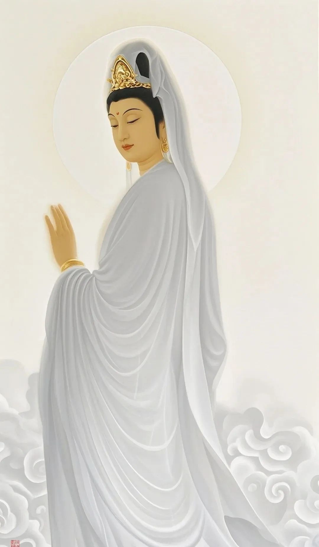 在构图上,一念法影可能巧妙地运用了空间与光影的对比,使观音形象更加立体而生动。观音或坐或立,姿态各异,但无一不透露出一种慈悲与智慧并存的气质。背景或许是一片祥云缭绕,或是山水清幽,与观音的形象相得益彰,共同营造出一种超凡脱俗的意境。